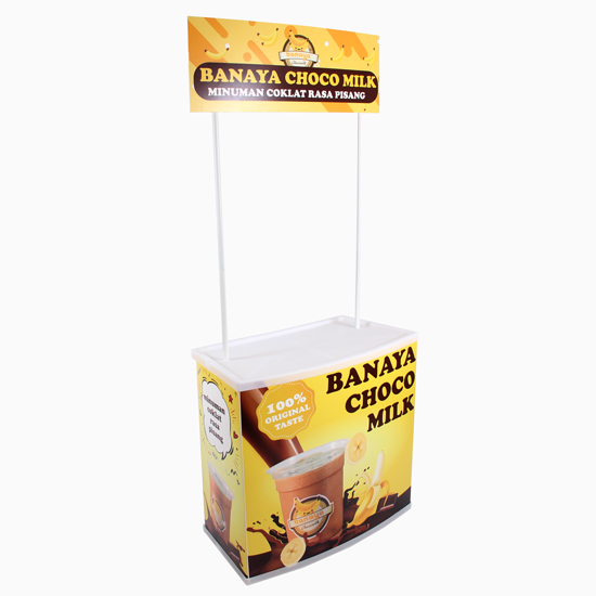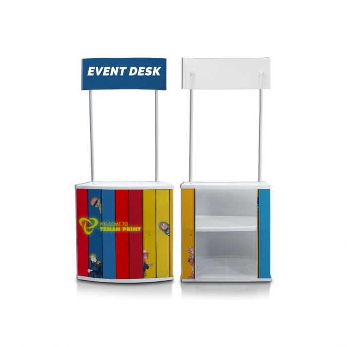 Event Desk, Meja promosi portabel yang praktis dan profesional, Terbuat dari bahan kokoh namun ringan sehingga mudah dipindahkan, Dilengkapi dengan area branding yang luas untuk menampilkan desain promosi Anda, Pemasangan dan pembongkaran sangat mudah, Cocok untuk pameran, bazar, promosi produk, atau acara-acara lain, Harga tertera adalah harga satu set Event Desk