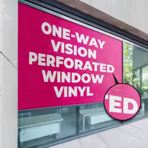 Stiker One Way Vision UV, Bahan stiker khusus dengan lubang-lubang kecil, Dicetak menggunakan teknologi UV yang menghasilkan warna tajam, detail tinggi, dan tahan lama, Memberikan efek visual satu arah, dapat melihat keluar dari dalam namun tidak dari luar, Tahan terhadap goresan dan paparan sinar matahari langsung, Cocok untuk aplikasi pada kaca jendela, pintu kaca, atau mobil, Ideal untuk promosi, branding, atau menambah privasi ruangan, Harga tertera adalah per lembar dengan ukuran 100 cm x 100 cm